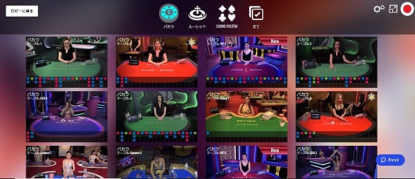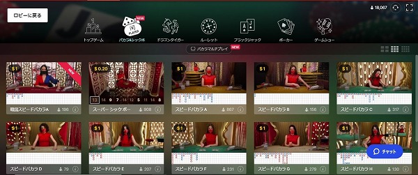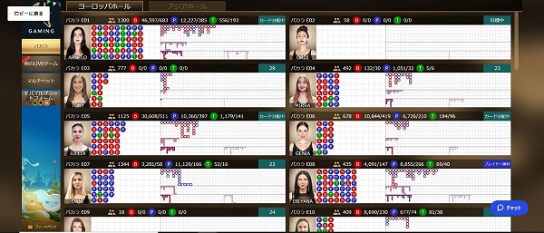 上のメニューから「バカラ」を選択します。テーブル数が非常に多いです。