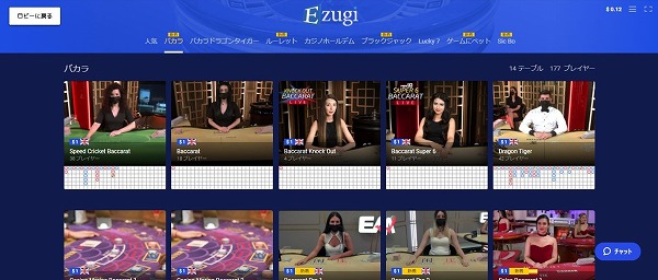 上のメニューから「バカラ」を選択します。ライブバカラは14テーブルあり、バリエーションも豊富です。