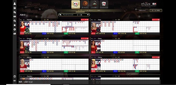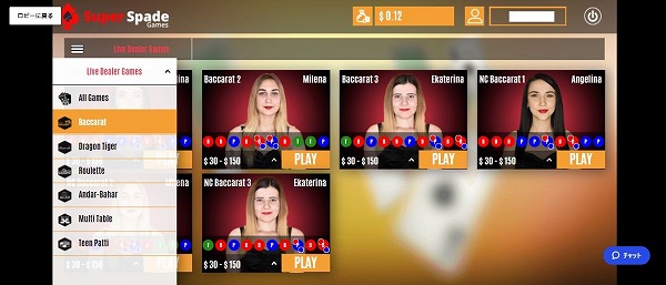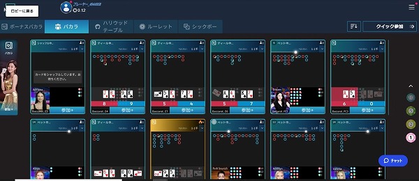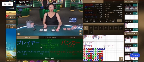 左のメニューから「バカラ」選ぶと、バカラテーブルが出てきます。