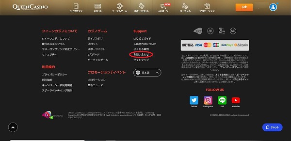 メールでの問い合わせ方法はコインカジノのサイトの一番下までスクロールし、「お問い合わせ」を押します。