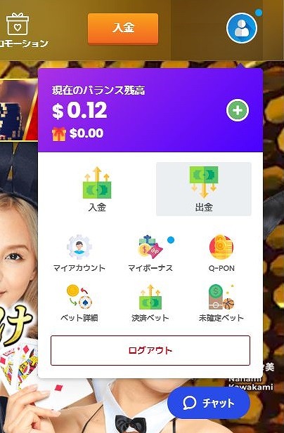 ログイン後、右上の水色のマークからメニューを開き「出金」を押します。