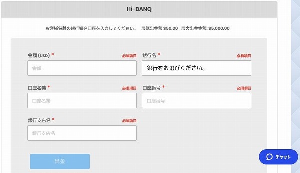 | 銀行振込(Hi-Banq) | 50ドル | 5,000ドル | 振込手数料のみ引かれる |